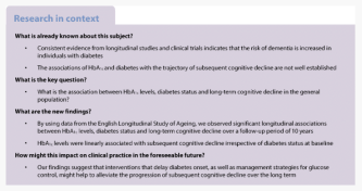 “The observed linear correlation of HbA1c levels with global cognitive decline was primarily driven by impairments in the domains of memory and executive function, which were assessed by immediate and delayed word recall tests and a verbal fluency task, respectively. This may suggest that cognitive decline related to high circulating glucose levels could be specific to dysfunction of certain brain regions or subcortical pathways involved in memory and executive function.”