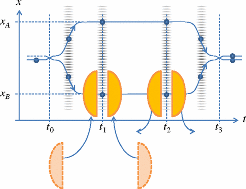 Then, the atoms are brought back together, and from the interference pattern that is produced, a phase shift emerges. The amount of the phase shift that’s measured should correspond to: