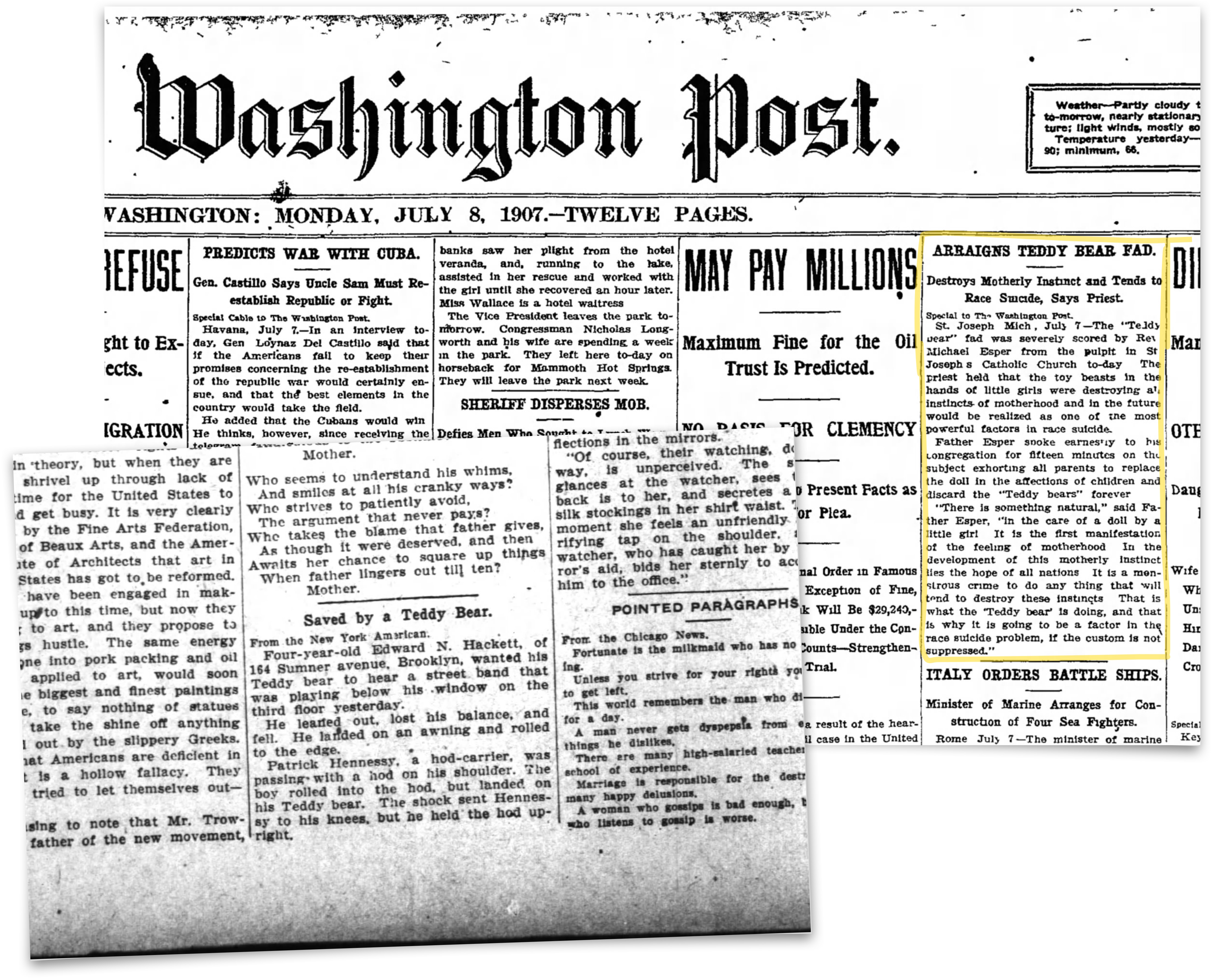 The rapid rise in popularity of these new toys among children would eventually catch the ire of Rev. Michael G. Esper, who warned that teddy bears would lead to “race suicide.” In a sermon, he preached: