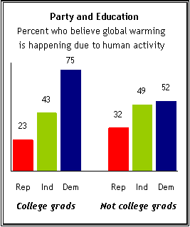 Pew reports striking educational differences in partisans’ views of global warming. According to the survey analysis, among Republicans, higher education is linked to greater skepticism about global warming — fully 43% of Republicans with a college degree say that there is no evidence of global warming, compared with 24% of Republicans with less education. The disbelief in global warming among the GOP college-educated persists despite the fact that the international scientific body assessing causes of climate change is closing in on its strongest statement yet linking emissions from burning fossil fuels to rising global temperatures.