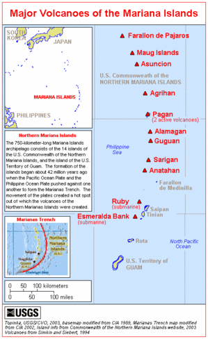 Guguan last erupted in the 19th century. Alamagan to the north has no definitive historic record of activity, although there was a false alarm in 1999. Pagan is one of the few islands (outside of the larger Saipan, Tinian, Rota and Guam) to have any population. Even minor activity there presents a concern due to this. Agrigan has a caldera that was the site of small eruption around 1917. The symmetrical cone of Ascuncion had reported activity early in the 20the century, but its northern neighbors, the Maug Islands, have no historic eruptions and are in fact the eroding remnants of a caldera. Further north we enter another seamount province, except for Uracas or Farallon de Pajaros. This particular volcano and its submarine neighbors seem to be particularly restless. North of FdP is considered to be the end of the Marianas and the start of the Bonin or Volcano Islands.