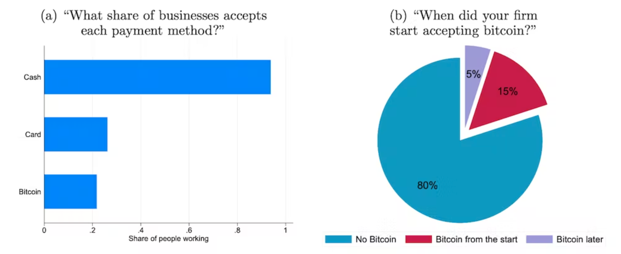 Among respondents who identified as business owners, just 20% said they were accepting bitcoins as payment. These were typically large companies (among the top 10% of companies by size).
