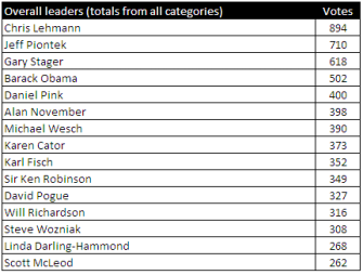 The top five – Chris Lehmann, Jeff Piontek, Gary Stager, Barack Obama, and Daniel Pink – received all or the majority of their votes in the leadership category.