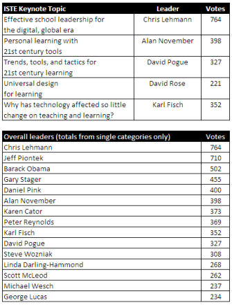 Here is the final leaderboard for the ISTE conference keynote crowdsourcing project. Category winners are Chris Lehmann, Alan November, David Pogue, David Rose, and Karl Fisch.