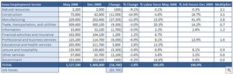 As the following chart illustrates, more Iowa workers were employed in May 2008 than in any other month in the past two years. Since then, Iowa has lost 65,700 jobs and gained 7,000, for an aggregate total of 58,700 jobs lost. The Construction and Manufacturing sectors represented about 20% of all of the jobs in Iowa in May 2008, but have represented nearly 60% of all the job losses since then. In other words, those two sectors are hemorrhaging jobs at a rate of about 3 times their representation in the state economy. Most other sectors’ losses have been roughly proportionate to their representation in the Iowa economy. Two sectors, Financial activities and insurance and Educational and health services, have actually seen employment gains since May 2008.