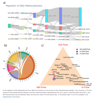 “Similarly, we observe large amounts of outflow from Russia after the cold war, greatly diminishing the presence of Russia mathematicians after the 1990s, and the second Italian mass diaspora after WWII. Beyond forced immigration, flow analysis also reveals the movement of reintegration. Japanese mathematicians immigrated to the United States following WWII, and continued throughout the 1960s to the 1990s. Twenty years later, Japanese mathematicians flowed back toward Japan.”