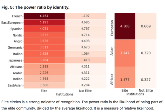 Meanwhile, an East Asian mathematician who also attends a top-50 institution is 4.5 times less likely to join an elite circle than the French mathematician, while an Indian mathematician is 6 times less likely. In general, the results showed that mathematicians from Arabic, African, and East Asian language identities were underrepresented.