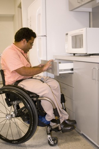 Man in wheelchair preparing to use microwave. Image source: PublicDomainFiles.com