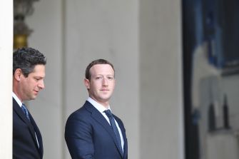 Facebook’s CEO Mark Zuckerberg (R), flanked by Facebook’s vice president of global public policy Joel Kaplan (ALAIN JOCARD/AFP/Getty Images)