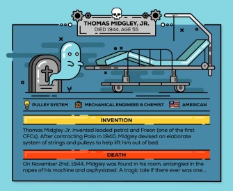 Accident Claims Advice has put together an infographic of inventors who wound up being killed by their inventions, or as the infographic puts it, “Inventing your own demise.” No doubt not what these folks intended, but, hey.
