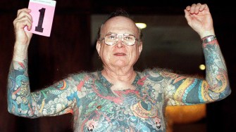 Larry Happ, 68, raises his arms to show his tattoos as he competes for the senior man largest tattoo during the Los Angeles Tattoo Convention. (Photo MATHILDE DE L’ECOTAIS/AFP/Getty Images)