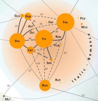 Italian is the vibrant centre of the Italic-Romance family, as close to Portuguese as it is to French. Spanish is a bit further. Romanian is an outlier, in lexical as well as geographic distance. Catalan is the missing link between Italian and Spanish. The map also shows a number of fascinating minor Romance languages: Galician, Sardinian, Walloon, Occitan, Friulian, Picard, Franco-Provencal, Aromanian, Asturian and Romansh. Latin, mentioned in the legend but not on the map, although no longer a living language, is an important point of reference, as it is the progenitor of all the Romance languages.