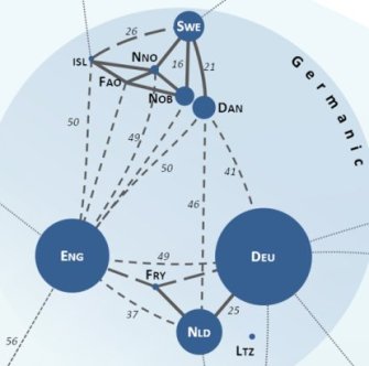 Lots of coldness and distance in the Germanic family. The bigger members English and German each keep to themselves. Dutch leans towards the German side, Frisian to the English side. Up north, the smaller Nordic languages cluster in close proximity; Danish, Swedish, Norwegian (both the Bokmal and Nynorsk versions). And look at the tiny Icelandic, Faroer and Luxembourgish languages. Aren’t they cute?