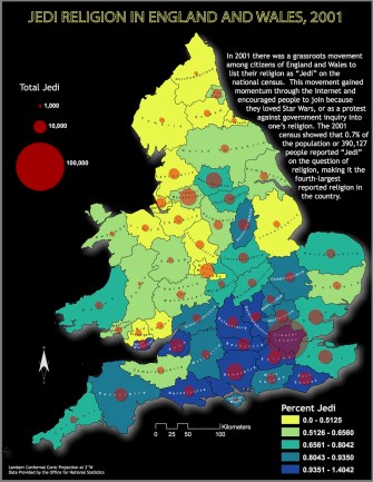 In 2001 in England and Wales, 390,127 people (almost 0.8%) identified as Jedi – more than Sikhism, Judaism and Buddhism. In absolute numbers, it was the biggest Jedi population in any country. Jedi was Britain’s fourth religion, after Christianity (70%), Islam (3.1%) and Hinduism (2.1%). The Jedi Jerusalem was Brighton, where a whopping 2.6% of those surveyed adhered to the Jedi faith.