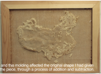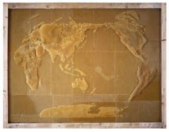 The oldest project, Yuansu I — The Origin of Geometry (2007-2011) consists of a series of beeswax maps. Ren Ri created these by making molds of the world and of various individual countries, placing them in the beehives. Upon removal a few months later, they revealed the honey-flavored topographies shown here.