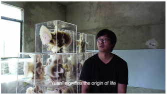 In the third of his yuansu projects, Ren Ri himself is the canvas, allowing himself to be covered and stung by a great number of bees. For Yuansu II, he put the queen bee in the middle of an acrylic box, modifying the honeycomb structure the worker bees built around her by changing the position. He did this every seven days — a reference to Genesis — and by throwing dice — an ironic rebuke of that famous Einstein quote [1].