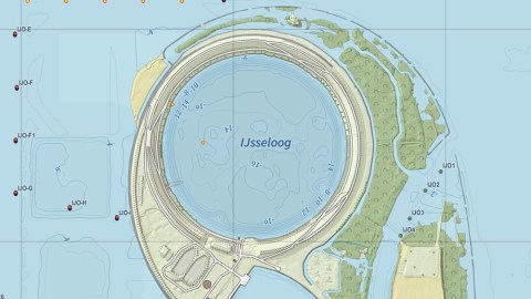 IJsseloog was started in 1996 and finished in 1999. At the centre of the island is a circular pit with a depth of about 150 feet (45 m) and about 3,280 feet (1 km) across, ring-fenced by a 10-foot (3-m) dyke. The reservoir can hold up to 880 million cubic feet (20 million cubic metres) of silt, with one third of that capacity reserved for silt from beyond the Ketelmeer.  Leakage into the Ketelmeer is prevented by keeping IJsseloog’s water below the level of the Ketelmeer (which on average is less than 10 feet deep).