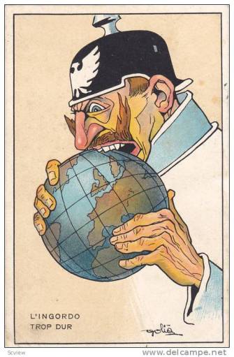 Wilhelm II is ferociously trying – but failing – to swallow the world whole. The title L’ingordo is Italian, and translates to: ‘The Glutton’. The subtitle is in French: Trop dur means‘Too hard’. The cartoon, produced by Golia [5], conveys a double message.