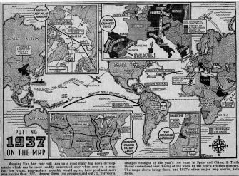 “Any year will turn up a good many big news developments which can be most readily understood only when seen on a map. But few years, map-makers probably would agree, have produced more map stories than 1937. Among them two groups stand out: 1. Territorial changes wrought by the year’s two wars, in Spain and China; 2. Trails blazed around and over the top of the world by the year’s aviation pioneers. The maps above bring these, and 1937’s other major map stories, into focus.”