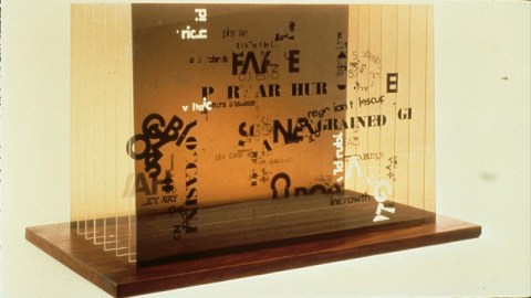 Less than a year after Duchamp’s death, Cage created Plexigram I–IV from Not Wanting to Say Anything about Marcel (shown above), a series of eight silkscreened Plexiglas panels placed on a walnut base that Cage called a “Plexigram.” Cage’s Plexigram telegraphs a message to Duchamp in the great beyond by echoing Johns’ response to a reporter asking for a comment on Duchamp’s passing. Each plexiglass panel features fragmented words and images that allude to The Large Glass, of course, but also honor Duchamp’s role in American modern art. In American art “A.D.”, after Duchamp, “every word is in a state of disintegration,” Cage says, suggesting perhaps that Duchamp’s friends will go on nonetheless, reintegrating art and life, because that’s what he would have wanted.