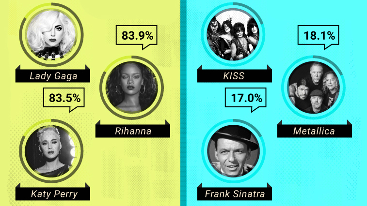 1,007 people were surveyed about their political affiliations and opinions, and their music tastes to learn to what extent they correspond to each other. Survey results are shown as infographics.