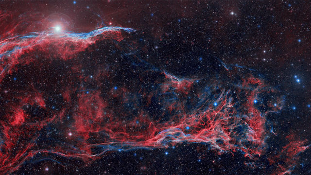 These red waves of glowing gas arch toward the constellation of Cygnus. They can be found in the western part of the Veil Nebula, the remnant of a large supernova […]