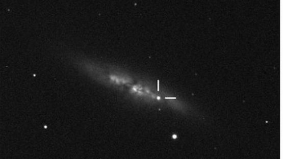 The light from an exploding star in the Messier 82 (aka “Cigar”) galaxy was first photographed from Earth on January 22nd, 2013.
