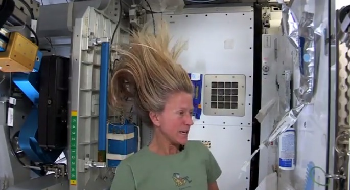 Expedition 36 Crew Member, astronaut Karen Nyberg, demonstrates how she washes her hair in space onboard the International Space Station.