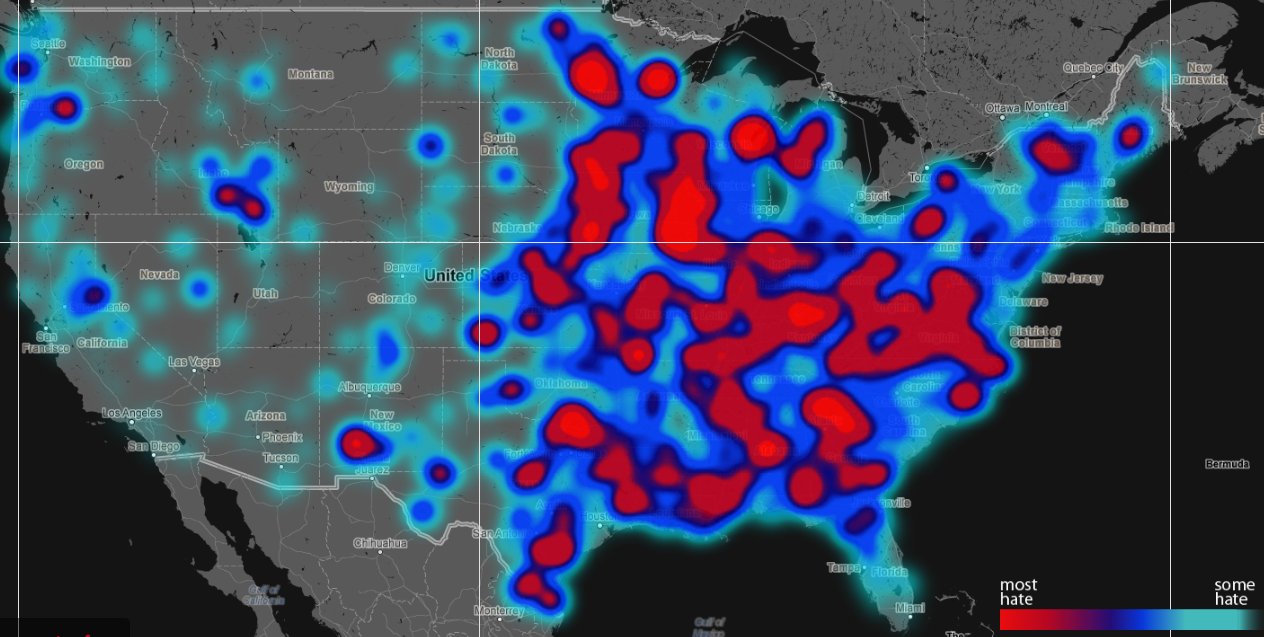 The image above maps the location of more than 150,000 geocoded tweets that contained words deemed to be racist, homophobic or that targeted people with disabilities.