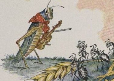 Illustration: Happy grasshopper sings, anxious ant toils. Guess who survives the winter? Illustration from the Aesop fable, via Wikimedia.