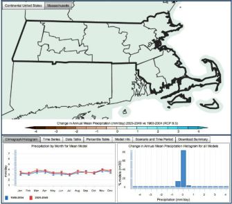 The tool (which, while a great step in the right direction is still geeky and too science/data heavy) is available here To see the data for where you live, just click on your state. I live just west of Boston. Here’s the map for the shift in high temperatures, between 2025 and 2049, compared to the average for the period between 1980 and 2004.