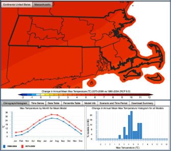 Click to the time sequence for 2075-2099, and things get more dramatic. Massachusetts residents will face average annual temperatures 3.5 – 4 C warmer (6.3 – 7.2 F) than the average between 1980 and 2004. And from 2075 to 2099, years in which anyone born today is likely to live, average Massachusetts highs and lows will both shift upwards about 4.5 -5.5 C (8-10 degrees F). The average high in August will be above 90 F. The average low in January won’t be cold enough for snow. That map looks like this.