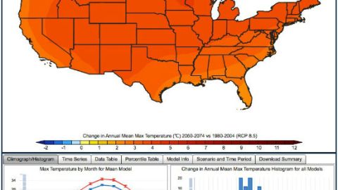So one challenge for climate change communicators is to find honest ways to help people see what significant changes in the climate will mean to them, in personal terms. And a new tool is a step in the right direction. The U.S. Geological Survey has put together what 31 computer models tell us about how climate change will impact our local weather. Not the big global climate picture. After all, who wakes up in the morning and checks out the global climate report? We don’t ‘think globally’. We check out the local weather report. That’s what this tool provides, all the way to the year 2099.