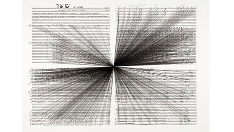[Image:Marco FusinatoMass Black Implosion (Shaar, Iannis Xenakis). 2012. Ink on archival facsimile of score, Part 1 of 5 parts, 32.3 x 43.1″ framed. Courtesy of the artist and Anna Schwartz Gallery, Melbourne & Sydney.]