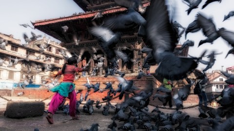 Pigeons Scatter in Kathmandu’s Patan Durbar Square as a young girl scampers through.
