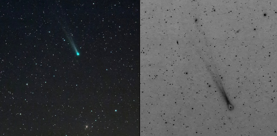 In the image above, the enlarged negative version on the right makes details of the long tail easier to trace, including the tail’s separated filaments toward the top of the frame. As NASA notes, the possibility of ISON’s survival to become a bright comet in planet Earth’s December skies remains a question.