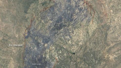 The image above shows the “burn scar” left from the Doce fire that has devastated the area around Prescott, Arizona. This natural-color image, taken from the Earth Observing-1 (EO-1) satellite, shows charred areas in grey; untouched areas in green; areas with little vegetation are tan. The rust-colored band is where 335,000 gallons of retardant was dropped by aircraft to contain the fire.