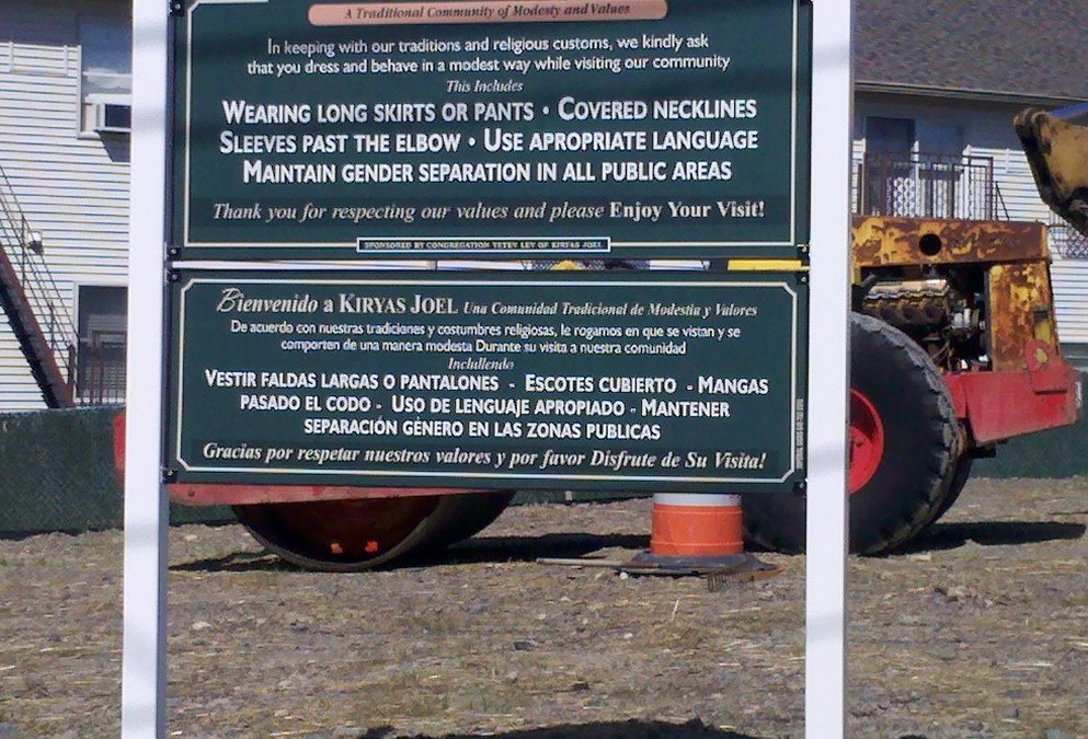 Image: This sign is posted at the entrance to Kiryas Joel, an ultra-Orthodox community in upstate New York. Photo by the author.