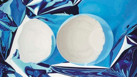 Powers’ steady hand soon began work on a painting titled Cracked Egg (shown above). A photo of a split eggshell sitting on reflective mylar was projected onto a white 80-square-foot canvas for tracing. Four other painters custom mixed paints to match the colors of the original photo and then coded sections of the drawing with the corresponding colors. “My job was simple: Paint by numbers,” Powers says with ultimate understatement. Sometimes using brushes with bristles “no longer than an eyelash,” Powers had “to hand-fashion a flat, seamless surface that appeared to have been manufactured by machine, which meant there could be no visible brush strokes, no blending, no mistakes.” Koons called for a perfect, mechanical, personless rendering of the original image and would settle for nothing less.