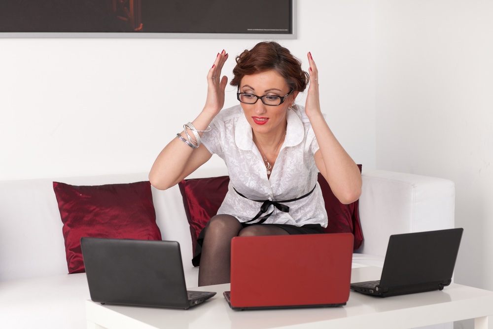 image: Stressed Young Businesswoman With Three Laptops / Shutterstock