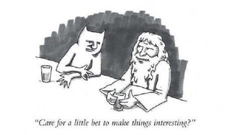 [Image:Shannon Wheeler. From The Book of Job. “Care for a little bet to make things interesting?”]