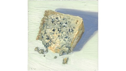 I’ll forgive Jeff Gordinier, a staff writer at the Times and author of the piece, for his title, “Like the Mona Lisa, but on a Cracker.” Gordinier focuses mainly on how Geno found himself painting cheeses. (He and/or the caption editor even go so far as to call Geno a “cheese portraitist,” as if the richer cheeses were looking for something to hang over the mantelpiece.) Following a personal “larkish culinary impulse,” Geno started out painting steaks, rapidly capturing a likeness in hours so that the subject would remain edible and delicious for that evening’s dinner. From there, Geno branched out into other meats, breads, donuts, and assorted foodie fantasies (including the quintessential staple of every Philadelphian’s diet, as Philly natives Geno and I know, the soft pretzel). But cheese remained the star food item. “I only paint things that I find attractive and appetizing,” Geno tells Gordinier. “I like to translate what I find the most seductive about my subject. And cheese, it turns out, is the absolute perfect match for the way I paint. I get hungry looking at cheese.”