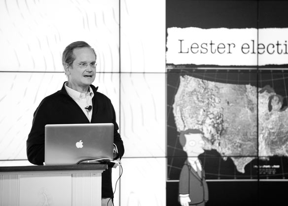 Lessig points out that .000015 percent, or 47 individuals, have given 42 percent of the Super PAC donations this election cycle. As a result of this “money election,” Lessig says a few powerful interests exert an influence that conflicts with the public good.
