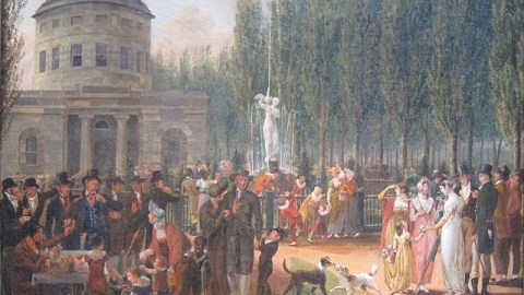 In Fourth of July, Center Square, Krimmel paints the whole spectrum of Philadelphia society at the time: plainly dressed Quakers stand to the left, more fashionably dressed affluent citizens cluster to the right, and middle classes muddle in the middle, naturally. The tableau of American classes stretches across the canvas like a classical frieze, with Benjamin Latrobe’s Greek Revival style Pump House, part of the Fairmount Water Works, presiding in the rear like the ghost of Greek Democracy itself. Closer to the ground, William Rush’s wooden sculpture, Water Nymph and Bittern, stands at the center of the first public fountain in America. Yellow Fever ravaged Philadelphia in 1793. Because many believed that Yellow Fever traveled via foul water, Philadelphia united to build a water treatment plant to combat the yellow peril. Krimmel picked this particular place at this particular time as a perfect emblem for a celebration of government of the people, by the people, and for the people. Although European class differences remained residually in the early 19th century, a greater egalitarianism was on the rise, as shown by the mingling of the different groups all in one American moment.