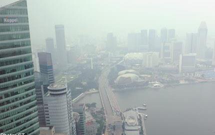 This photo depicts the smog hanging over Singapore. Conditions today have become so hazardous that business activities in the city-state, a major commercial center, are starting to grind to a halt.