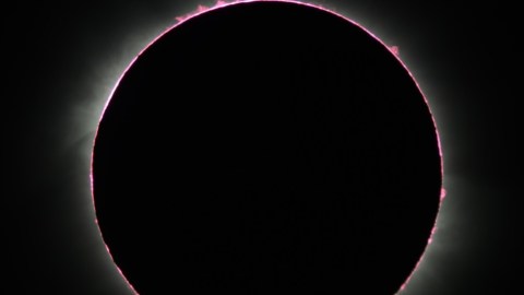 What we see is the “reddish hydrogen alpha glow of the solar chromosphere” around the lunar silhouette, “fading into the Sun’s tenuous, hot, outer atmosphere or corona.”
