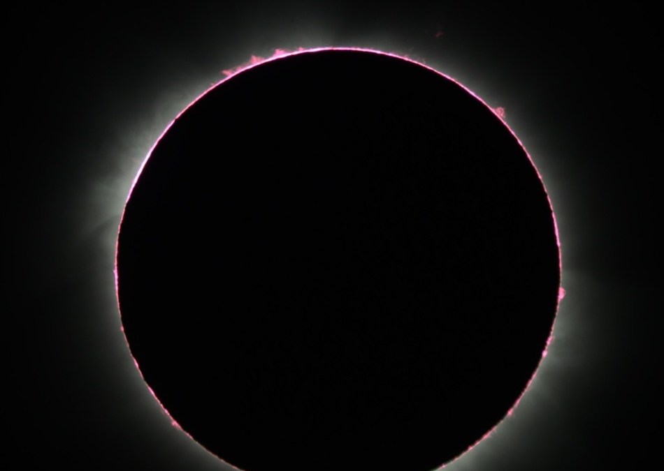 What we see is the “reddish hydrogen alpha glow of the solar chromosphere” around the lunar silhouette, “fading into the Sun’s tenuous, hot, outer atmosphere or corona.”