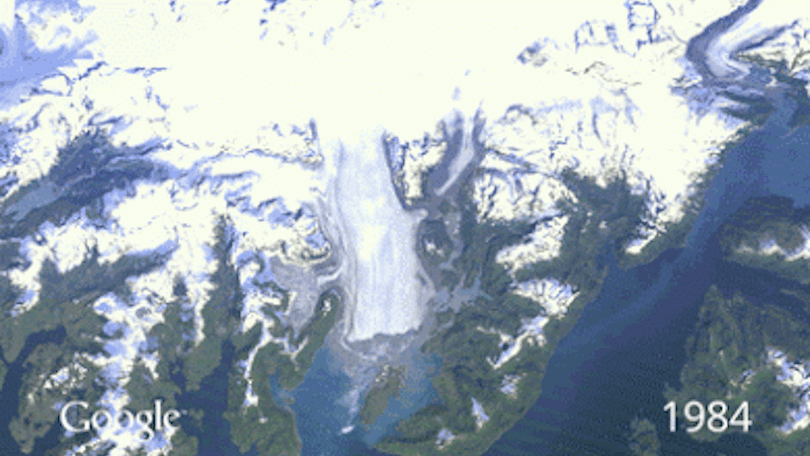 The image above depicts Alaska’s Columbia Glacier retreat from 1984 to 2011. This is just one of the many stunning phenomena that can be observed using the tools of the recently launched Timelapse project.