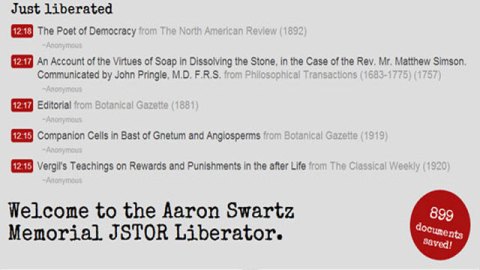 Within days of the death of Aaron Swartz, academics began posting their research papers online for free using the Twitter hashtag #PDFTribute. Within minutes a scraper popped up to database the links at pdftribute.net. Now, a browser plugin called the “Aaron Swartz Memorial JSTOR Liberator” has been developed which will use an individual’s credentials to “liberate a single document” every time the bookmarklet is clicked. Users are warned this is a breach of terms of service, similar to that committed by Aaron Swartz. Once again we seem to be witnessing the Streisand Effect in action.