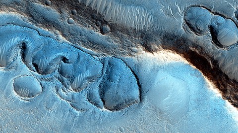 False coloring is used in this image to reveal greater detail. The image here depicts mystery martian morphology. It captured by the High Resolution Imaging Science Experiment (HiRISE) camera aboard the Mars Reconnaissance Orbiter.